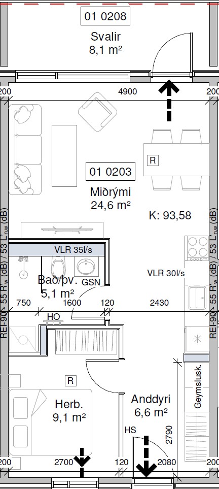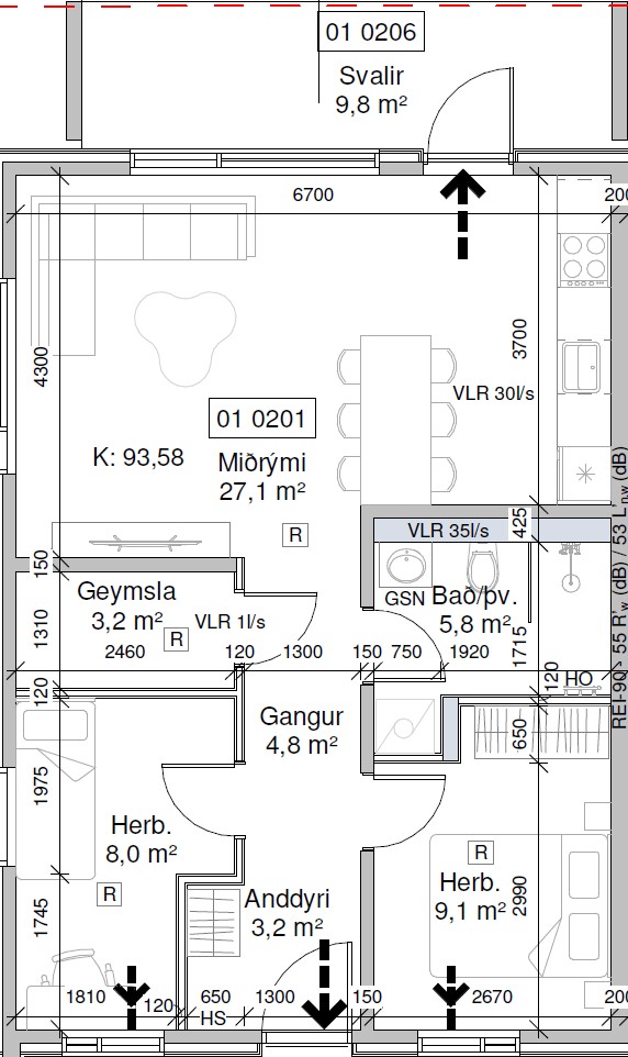 The three-bedroom apartments are 91,0 m² and are divided into three bedrooms, a bathroom, and a living room with a kitchen. Storage space is within the apartment and a wardrobe is in the master bedroom. The apartments on the ground floor have their separate outside area and the apartments on the upper floors all have a balcony.