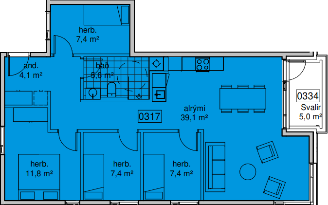 The one-bedroom apartments in Bátavogur range from 40,4 - 53,7 m². The apartments have one bedroom (some with a sliding door), a living room with a kitchen and a bathroom. In some apartments, the bedroom is a sleeping area, closed with a sliding door. Storage space is in closets within the apartment and in the basement. The bedroom has a wardrobe.