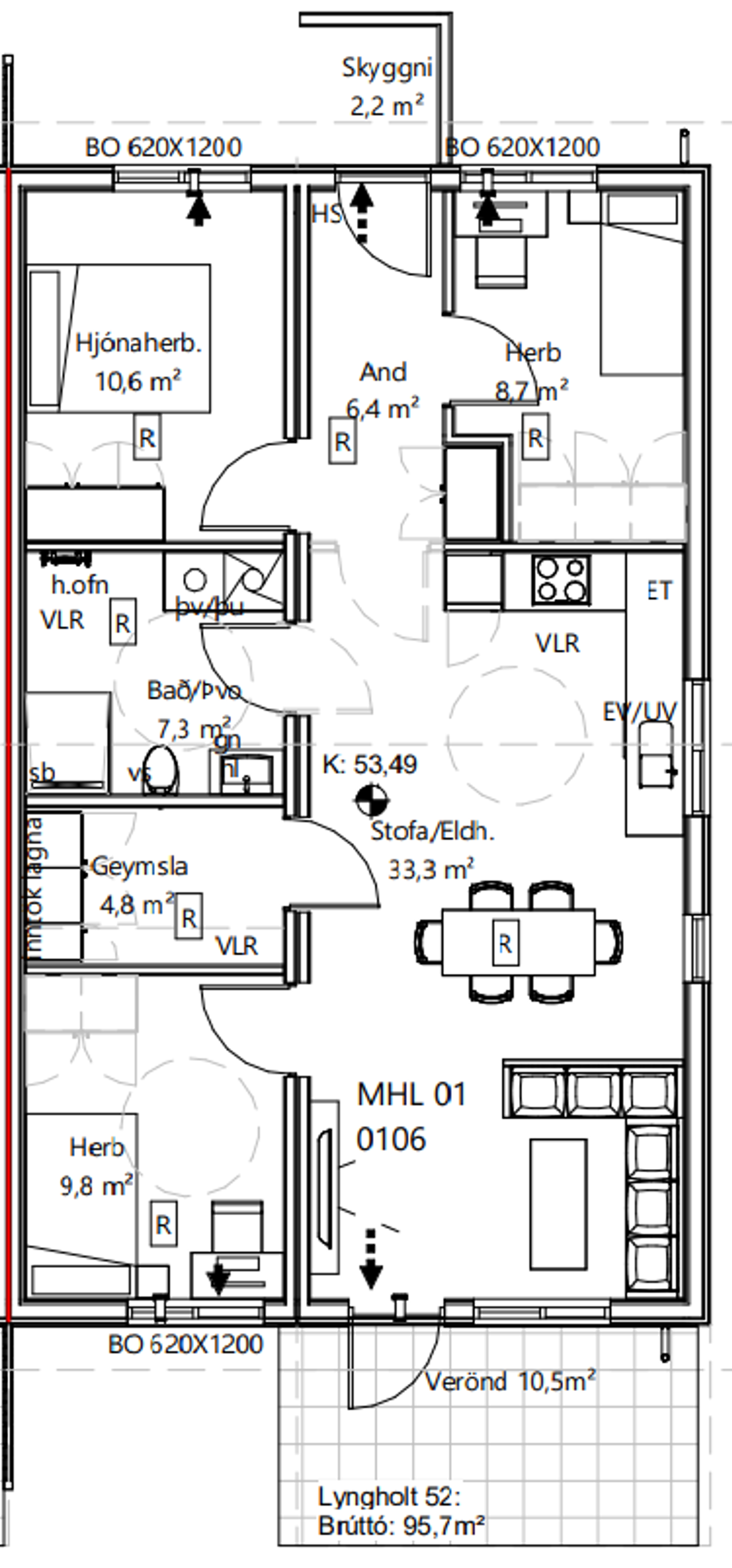 The apartments are 94,9 m² and 95,7 m² and are divided into three bedrooms, a bathroom, and a living room with a kitchen. Storage space is within the apartment and a wardrobe is in the master bedroom.