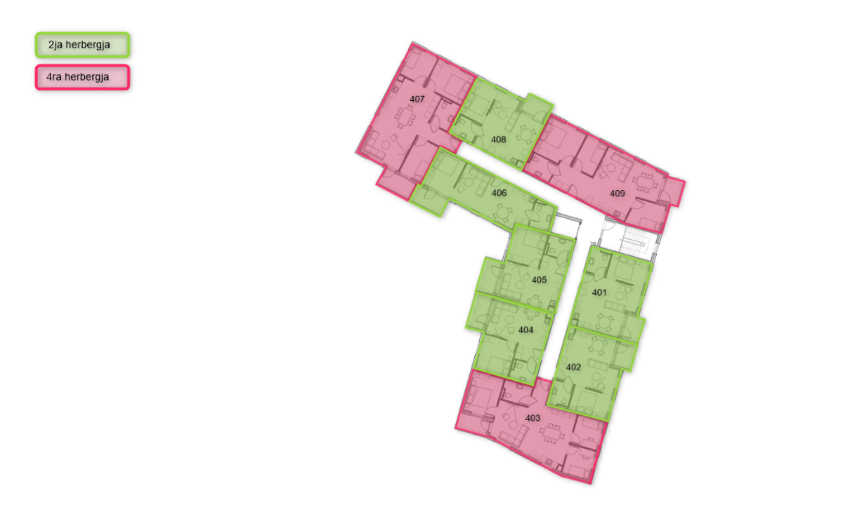 The four bedroom apartments are approx. 113 m² and are divided into four bedrooms, a bathroom, and a living room with a kitchen. Storage space is in closets inside the apartment and a wardrobe is in the master bedroom.