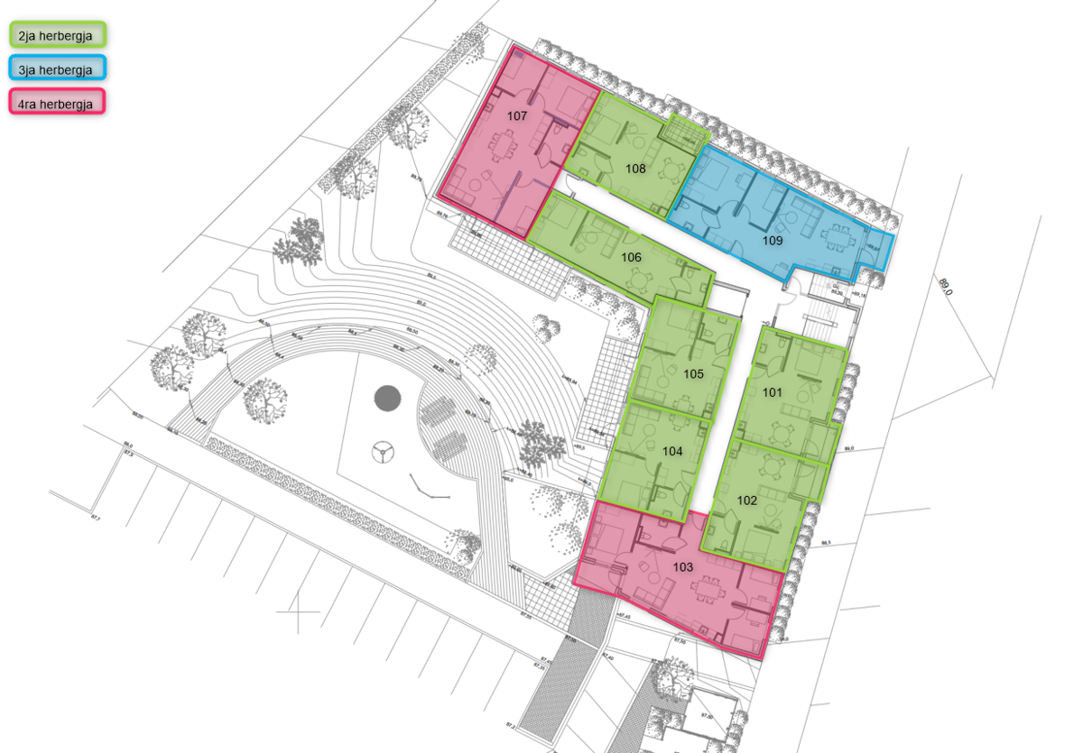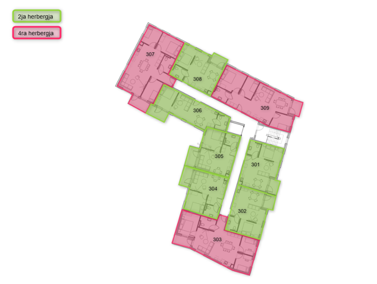 The three bedroom apartments are 82,7 - 95,6 m² and are divided into three bedrooms, a bathroom, and a living room with a kitchen. Storage space is in closets inside the apartment and a wardrobe is in the master bedroom.