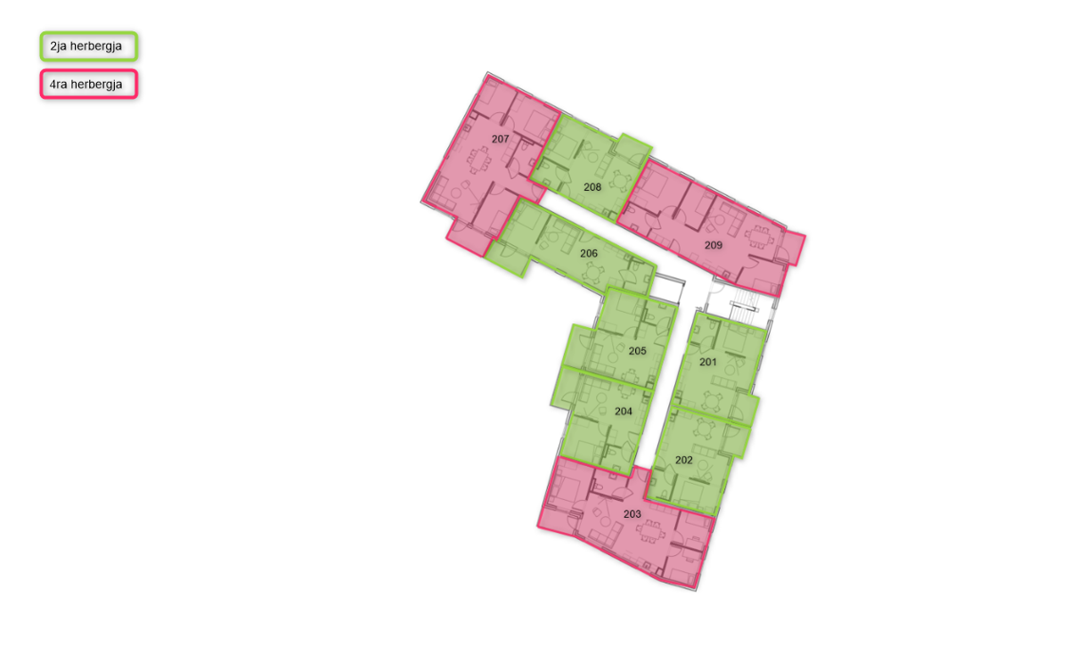 The two bedroom apartments are 56,8 - 74,3 m² and are divided into two bedrooms, a bathroom, and a living room with a kitchen. Storage space is in closets inside the apartment and a wardrobe is in the master bedroom.