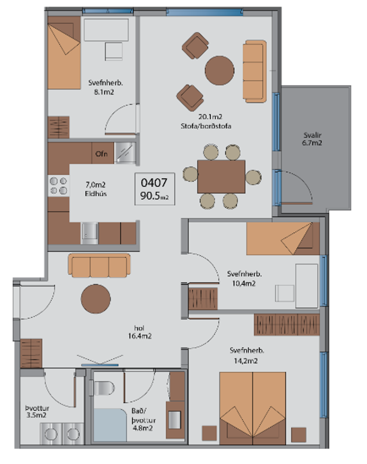 The furnishings in all apartments are from HTH from Ormsson. Electrical appliances are from AEG. The kitchen comes with a refrigerator, dishwasher, oven and hob. The floors in the apartments are high-quality hardwood flooring with soundproofing, and tiles on the floors in wet rooms.