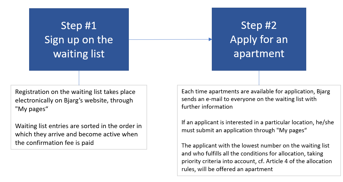 Each time apartments are available for application, Bjarg sends an e-mail to everyone on the waiting list with further information. If an applicant is interested in a particular location, he/she must submit an application. Applications are done electronically on Bjarg’s website, www.bjargibudafelag.is, through "My pages". The applicant with the lowest number on the waiting list and who fulfills all the conditions for allocation, taking priority criteria into account, cf. Article 4 of the allocation rules, will be offered an apartment.