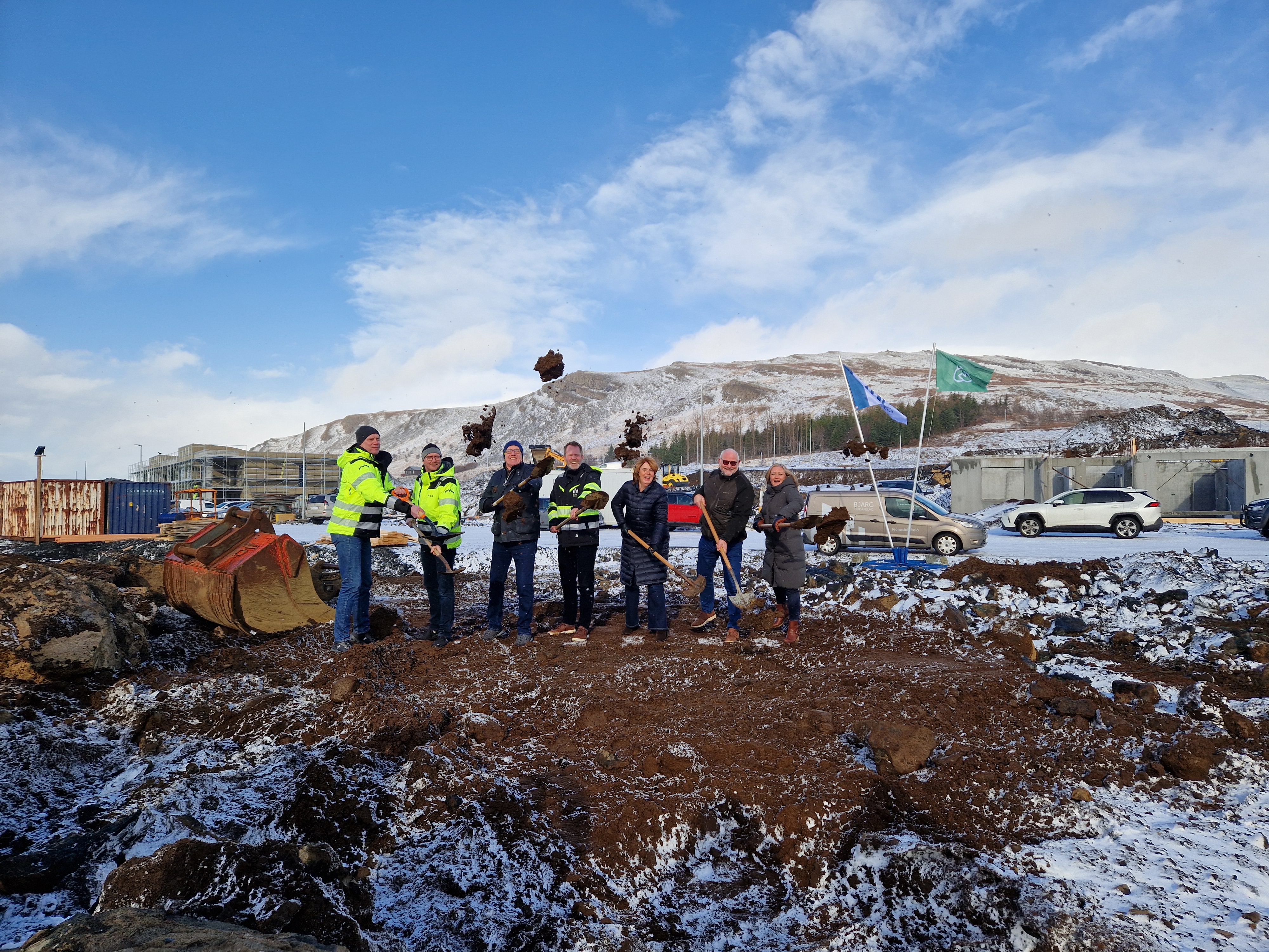 Fyrsta skóflustungan (f.v): Baldur Pálsson og Hjálmar Jónsson hjá Eðalbyggingum, Finnbogi Hermannson formaður ASÍ, Björn Traustason framkvæmdastjóri Bjargs, Regína Ásvaldsdóttir bæjarstjóri Mosfellsbæjar, Ólafur Óskarsson formaður velferðarnefndar Mosfellsbæjar og Sigurbjörg Fjölnisdóttir sviðsstjóri velferðarsviðs Mosfellsbæjar.