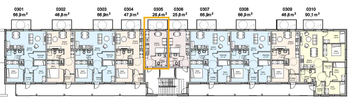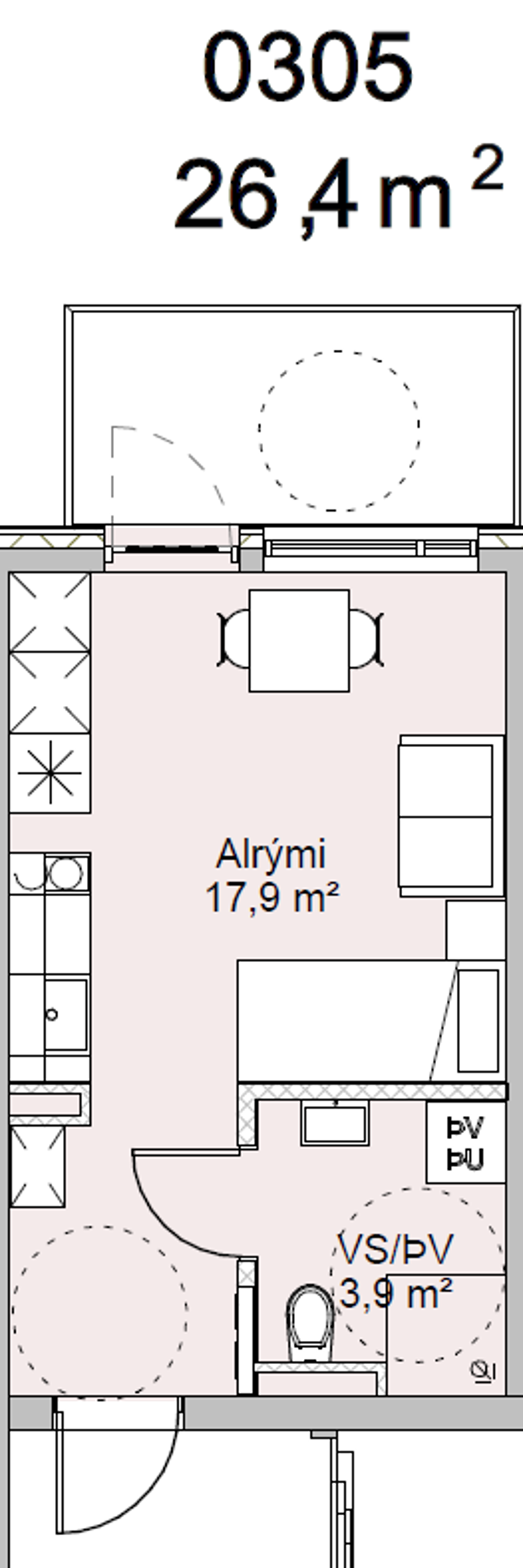 Stúdíóíbúðirnar eru 25,8 m² og 26,4 m² og skiptast í alrými með eldhúskrók og baðherbergi. Geymsluskápur er innan íbúðar og í íbúðinni er fataskápur.