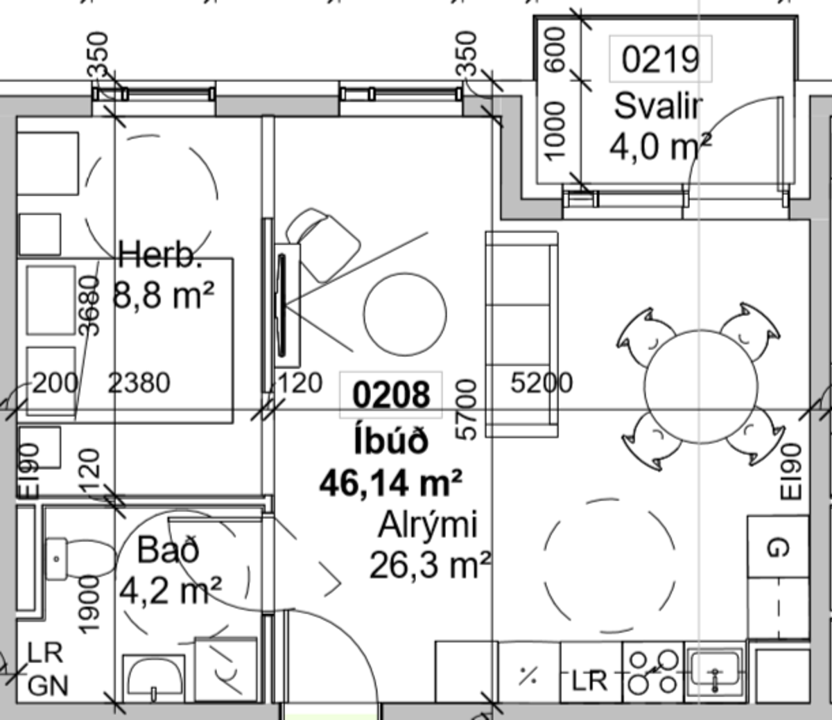 Stúdíóíbúðirnar í Urðarbrunni eru 46,1 - 49,1m² og skiptist þær í alrými með eldhúsi, afstúkað svefnrými og baðherbergi. Geymslurými er í skápum innan íbúðar og í íbúðinni er fataskápur.