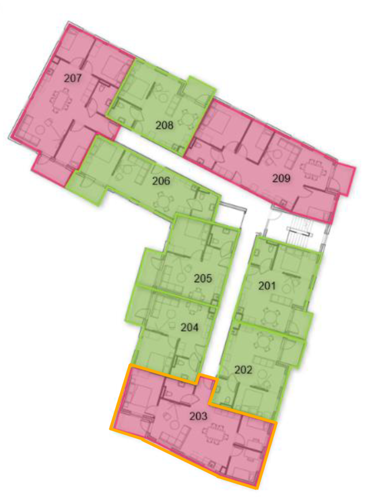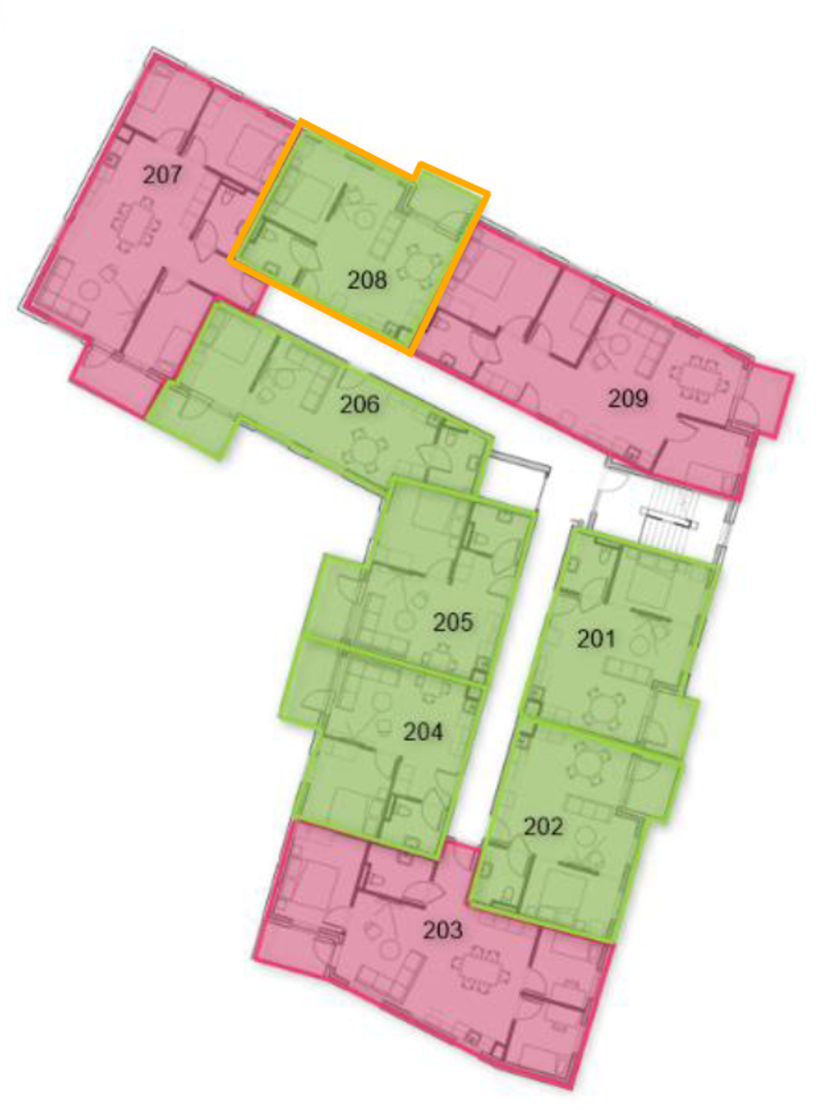 Tveggja herbergja íbúðirnar eru frá 36,6 - 49,1 m². Í þeim er eitt herbergi, eldhúskrókur og baðherbergi. Geymslurými er í skápum innan íbúðar og í íbúðinni er fataskápur.
