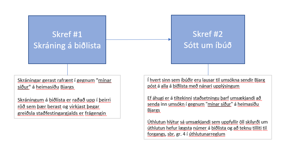 Athugið að skráning á biðlista er ekki umsókn um íbúð, Bjarg íbúðafélag sendir upplýsingar um íbúðir eftir því sem þær eru lausar til umsóknar. Við úthlutun ræður lægsta númer á biðlista.